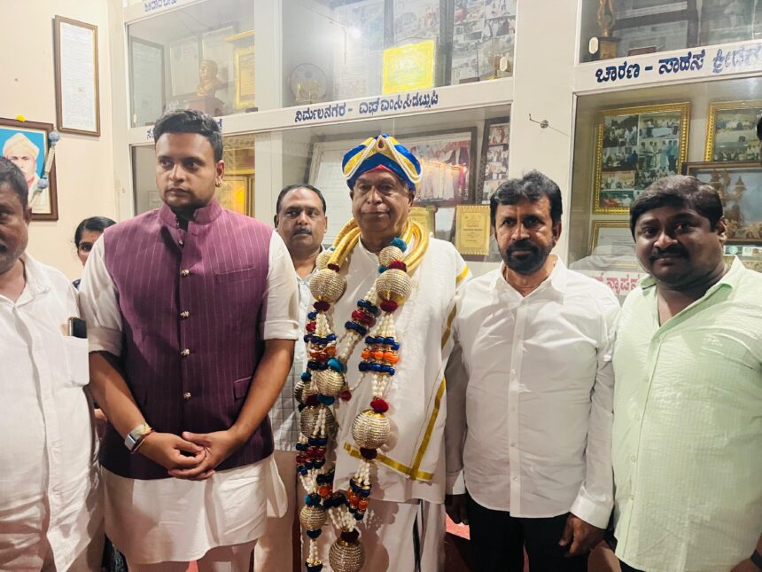 ಬೆಂಗಳೂರು ವಿಶ್ವವಿದ್ಯಾನಿಲಯದಿಂದ ಡಾಕ್ಟರೇಟ್ ಪಡೆದ ಕುಂಬಾರ ಕೊಪ್ಪಲಿನ ಡಿ.ಮಾದೇಗೌಡ ಅವರನ್ನು ಅವರ ನಿವಾಸದಲ್ಲಿ ಸಂಸದ ಯದುವೀರ್ ಕೃಷ್ಣದತ್ತ ಚಾಮರಾಜ ಒಡೆಯರ್ ಹಾಗೂ ಮಾಜಿ ಶಾಸಕ ಎಲ್.ನಾಗೇಂದ್ರ ಸನ್ಮಾನಿಸಿ ಗೌರವಿಸಿದರು.
