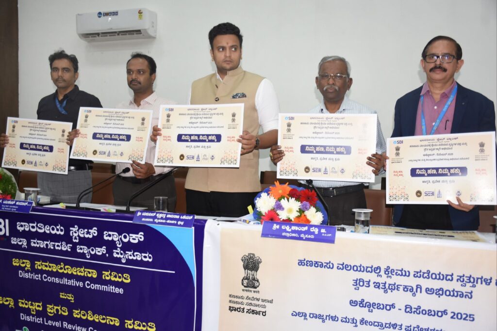 ದಿನಕ್ಕೆ ೧೦೦ ಅಕೌಂಟ್ ಇತ್ಯರ್ಥ: ಕೇಂದ್ರಸರ್ಕಾರದ ಸೂಚನೆಯಂತೆ ಹಣಕಾಸು ವಲಯದಲ್ಲಿ ಕ್ಲೇಮು ಪಡೆಯದ ಸ್ವತ್ತುಗಳ ಮತ್ತು ತ್ವರಿತ ವಾರಸುದಾರರ ಪತ್ತೆ ಇತ್ಯರ್ಥಕ್ಕಾಗಿ ಕೈಗೊಂಡಿರುವ ಎರಡು ತಿಂಗಳ ಅಭಿಯಾನದಲ್ಲಿ ದಿನಕ್ಕೆ ೧೦೦ ಅಕೌಂಟ್ಗಳನ್ನು ಇತ್ಯರ್ಥಪಡಿಸುವಂತೆ ಸೂಚಿಸಲಾಯಿತು. ಬ್ಯಾಂಕಿನ ವ್ಯವಸ್ಥಾಪಕರು ಹಾಗೂ ಸಿಬ್ಬಂದಿ ತಂತಮ್ಮ ವ್ಯಾಪ್ತಿಯಲ್ಲಿ ಗ್ರಾಹಕರನ್ನು ಕರೆತಂದು ಇತ್ಯರ್ಥಪಡಿಸಬೇಕು ಎಂದು ಹೇಳಲಾಯಿತು.ಜಿಲ್ಲೆಯ ಕೆನರಾ ಬ್ಯಾಂಕ್,ಎಸ್ಬಿಐ,ಯೂನಿಯನ್ ಬ್ಯಾಂಕ್ ಆಫ್ ಇಂಡಿಯಾ ಸೇರಿದಂತೆ೩೧ ಬ್ಯಾಂಕ್ಗಳಿಂದ ೫೩೪ ಶಾಖೆಗಳಿವೆ. ಅದರಲ್ಲಿ ೫೦೫೪೨೪ ಖಾತೆದಾರರಿದ್ದು, ೧೫೭.೩೩ ಕೋಟಿ ರೂ. ಹಣವಿದೆ. ಈ ಗ್ರಾಹಕರನ್ನು ಕರೆತಂದು ಕ್ಲೇಮು ಮಾಡುವಂತೆ ಮಾಡಬೇಕಿದೆ ಎಂದರು. ಇದೇ ಸಂದರ್ಭದಲ್ಲಿ ಪ್ರಧಾನಮಂತ್ರಿ ಸುರಕ್ಷಾ ಭೀಮಾ ಯೋಜನೆ, ಪ್ರಧಾನಮಂತ್ರಿ ಜೀವನ್ ವಿಮಾ ಯೋಜನೆಯಡಿ ಮೈಸೂರು ಜಿಲ್ಲೆಯಲ್ಲಿ ಆಗಿರುವ ಸಾಧನೆಯನ್ನು ಪರಿಗಣಿಸಿ ದ್ವಿತೀಯ ಸ್ಥಾನ ದೊರೆತಿರುವುದನ್ನು ಪ್ರಕಟಿಸಲಾಯಿತು. ಜಿಲ್ಲಾಧಿಕಾರಿ ಜಿ.ಲಕ್ಷ್ಮೀಕಾಂತ್ ರೆಡ್ಡಿ, ಜಿಪಂ ಮುಖ್ಯ ಕಾರ್ಯ ನಿರ್ವಹಣಾಧಿಕಾರಿ ಎಸ್.ಯುಕೇಶ್ ಕುಮಾರ್, ಆರ್ಬಿಐ ಸಹಾಯಕ ಪ್ರಧಾನ ವ್ಯವಸ್ಥಾಪಕ ಆರ್.ಪ್ರಭಾಕರನ್,ನಬಾರ್ಡ್ ಡಿಜಿಎಂ ಶಾಂತವೀರ್ ಹಾಜರಿದ್ದರು.
